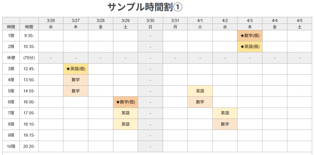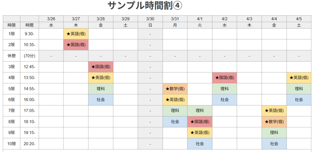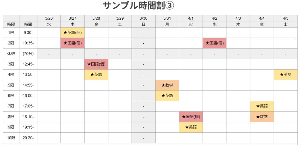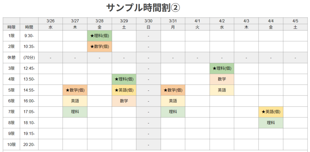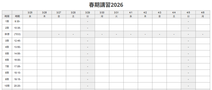 春期講習期間の時間割